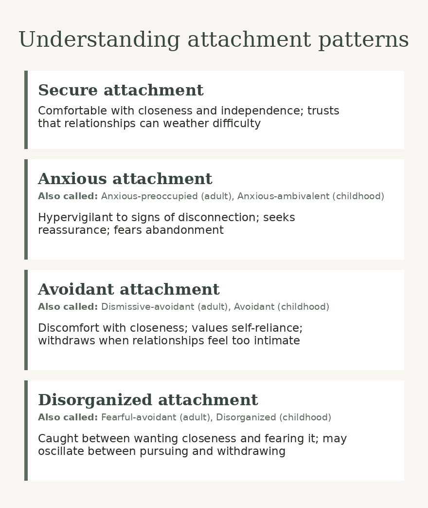 Attachment patterns often show up differently across relationships—you might notice one pattern with romantic partners and another with close friends or family. And patterns developed in childhood can change. Through new relational experiences and therapeutic work, it's possible to develop what researchers call “earned secure attachment.”